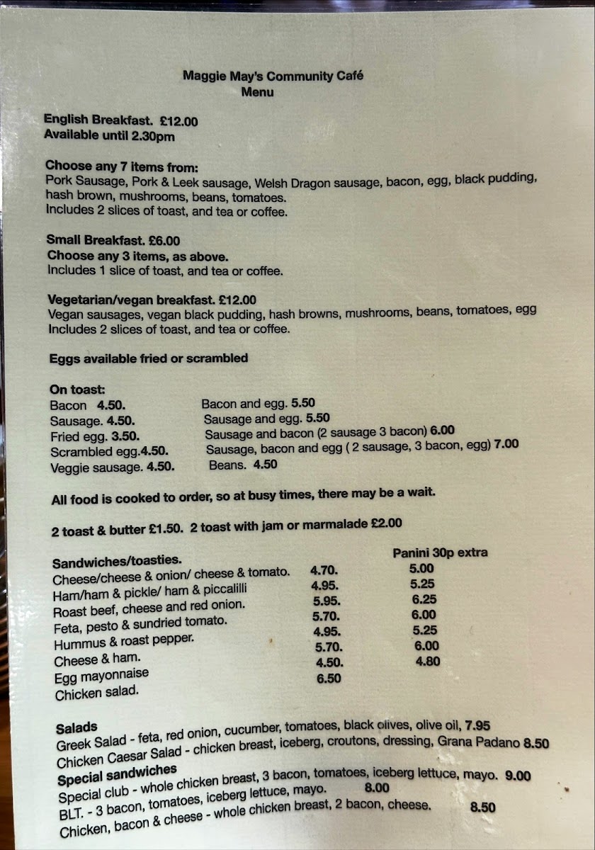 Maggie May's Community Cafe Menu